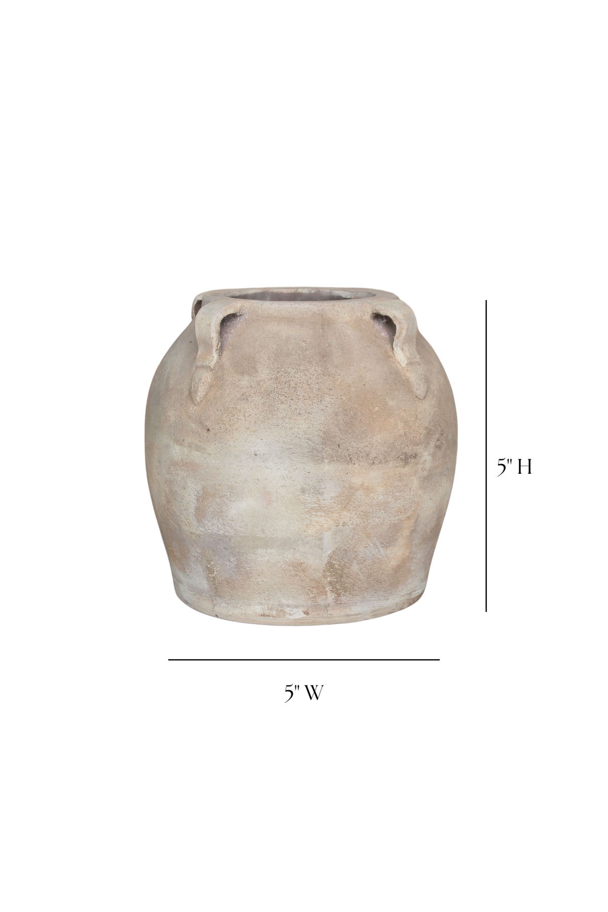 Dimensions 5" W x 5" H approx. The Luxe B Co. Blanc Beige Wash Vase With Handles Small is a vintage inspired vase, made from terracotta. It is ideal for bringing a touch of originality to your home decor, whether placed on shelves, coffee tables, dining tables, or in bedrooms. The soft, beige colour of these vases allows for versatile styling options. They can be paired with dried flowers for a decorative touch, or displayed on their own for a simple yet elegant look. This vase is also offered in Medium and Large sizes. The finish has a weathered appearance that resembles chalk. It's normal for some of the wash to come off when you unpack the vase. Beneath the light wash, you'll find subtle hues of gray, beige, and pink that can be speckled in the wash. Made in Vietnam